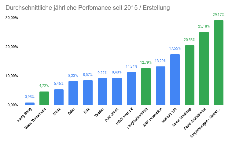 Schauen wir uns noch die durchschnittliche jährliche Performance der letzten 11 Jahre aller Vergleichswerte an. Auch hier habe ich alle meine anderen wikifolios mit aufgeführt. Immerhin drei von fünf haben es langfristig geschafft, alle Vergleichsindizes zu schlagen, das Langfristfavoriten wikifolio ist ebenfalls vorne mit dabei, lediglich das Turnaround wikifolio zeigt, dass Turnarounds zu timen eine Herausforderung ist und dieses wikifolio mit dieser speziellen Teilstrategie bisher keine zufriedenstellende Performance liefern konnte.