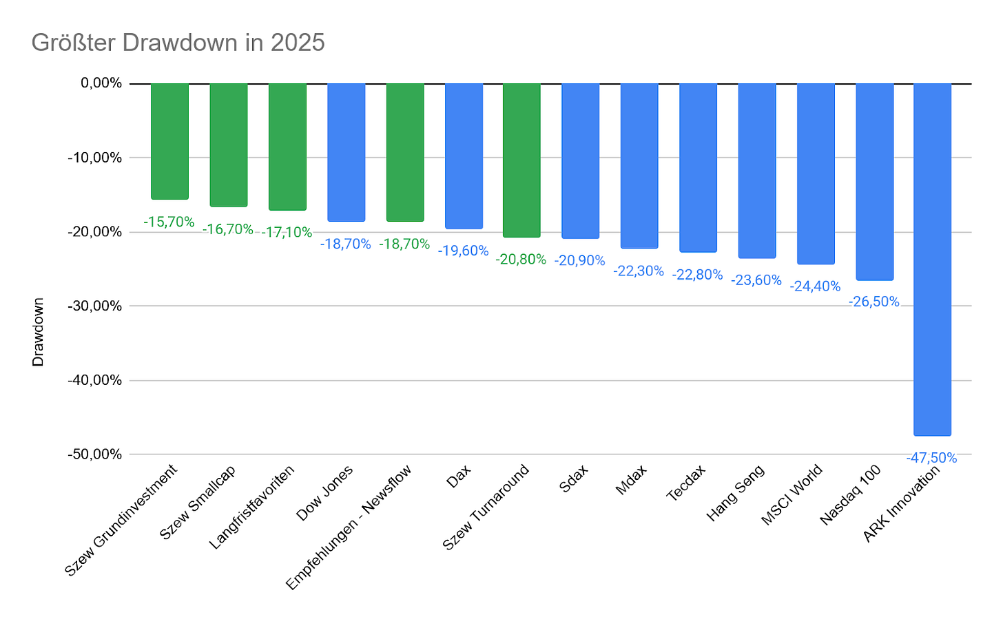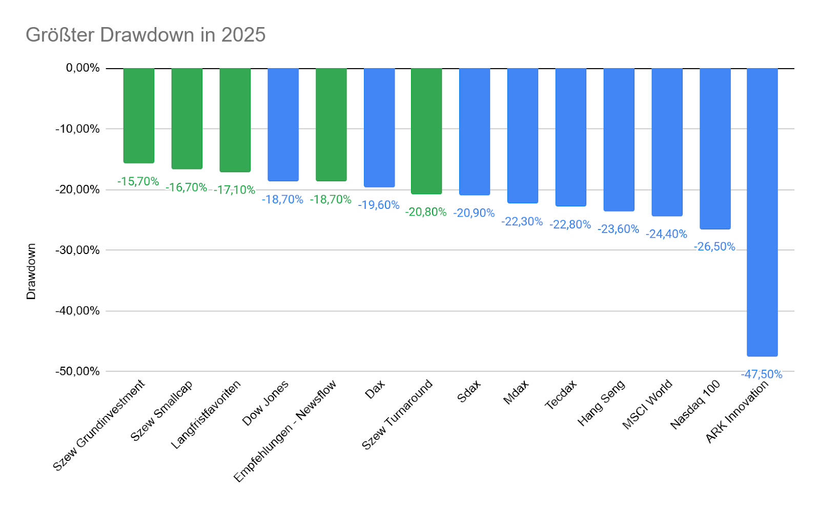 Diese stabile Entwicklung sehen wir auch, wenn wir uns die größten Drawdowns aller Vergleichswerte in diesem Jahr anschauen. Mit einem größten Rücksetzer von -15,7% konnte das Szew Grundinvestment wikifolio sich von allen Vergleichswerten am stabilsten halten. Das war auf die eher defensive Ausrichtung in Verbindung mit der Säulenstrategie zurückzuführen, welche verschiedene Makrorisiken gut austariert hat.