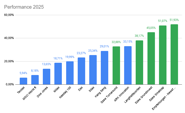 Aber wie immer möchte ich die Performance nicht nur mit einem Index/Etf messen, sondern möglichst alle schlagen, daher hier auch nochmal der große Performance Vergleich für das Jahr 2025.